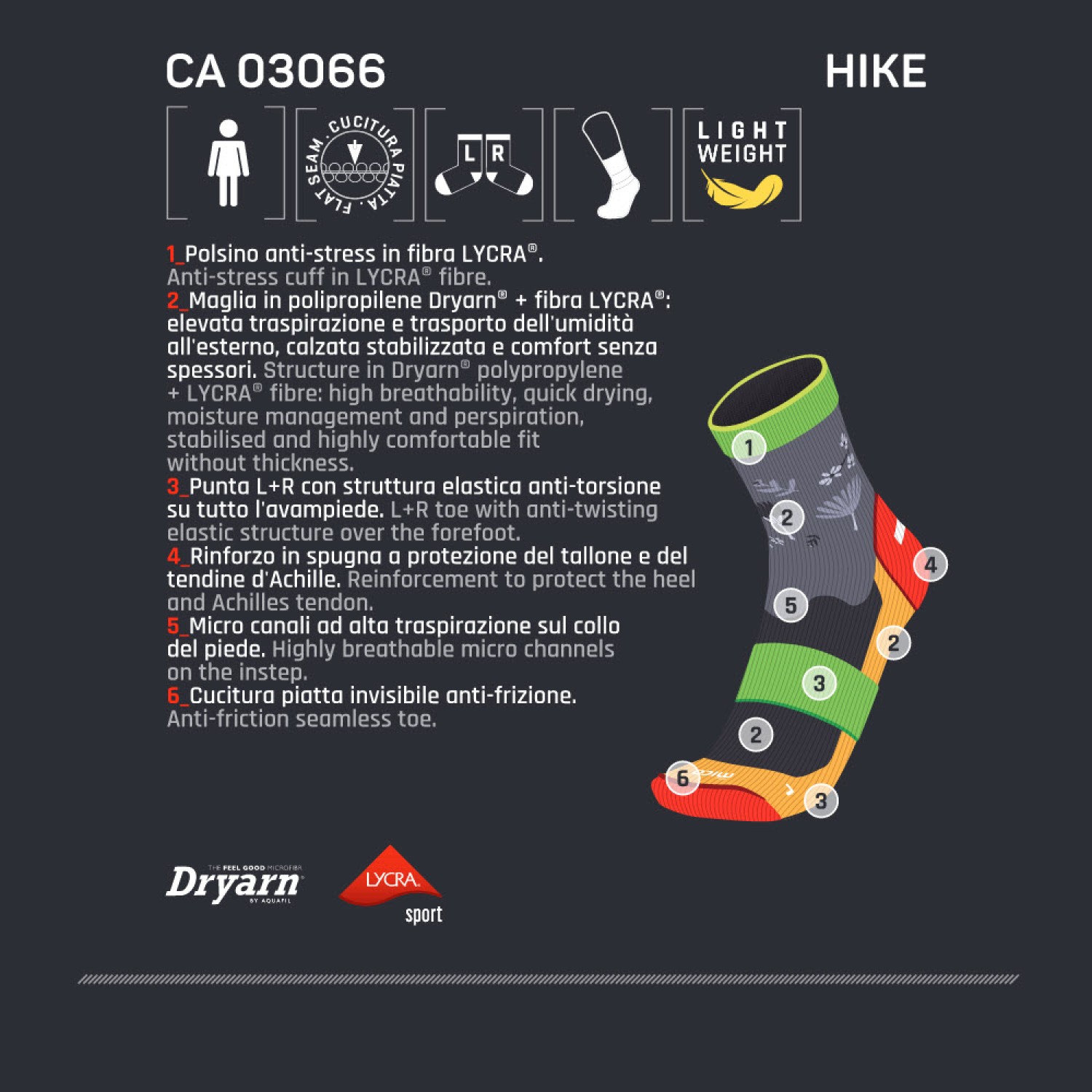 Οι κάλτσες outdoor Mico Extra DryLight Weight είναι κατασκευασμένες από πολυπροπυλένιο Dryarn® + ίνα LYCRA®: υψηλή αναπνοής, για γρήγορο στέγνωμα, διαχείριση της υγρασίας και αποβολής του ιδρώτα , εξαιρετική πρόσφυση, ελαστικότητα και άνεση χωρίς ιδιαίτερο πάχος. Εργονομική κατασκευή δακτύλων σε ελαφρύ σφουγγάρι με πρότυπο την ανατομία των πέντε δακτύλων. To υλικό εσωτερικά , σε συνδυασμό με το PA πού επίσης υπάρχει σαν υλικό είναι πάρα πολύ ανθεκτικό και μεταφέρει την υγρασία από το εσωτερικό πρός τα έξω κρατώντας το πόδι σας στεγνό και ζεστό. Ειδικές ενισχύσεις στα σημεία πού καταπονούνται περισσότερο με τα μποτάκια σας καθώς και στον αστράγαλο και στον αχίλλειο τένοντα .Δεξιά και Αριστερή κάλτσα για  ανατομικό σχεδιασμό με επίπεδη ραφή στα δάκτυλα για μεγαλύτερη άνεση , καθώς δεν προκαλεί φαγούρα και κνησμό. Ειδική κατασκευή κρατάει την κάλτσα πάντα σταθερή στο πόδι.