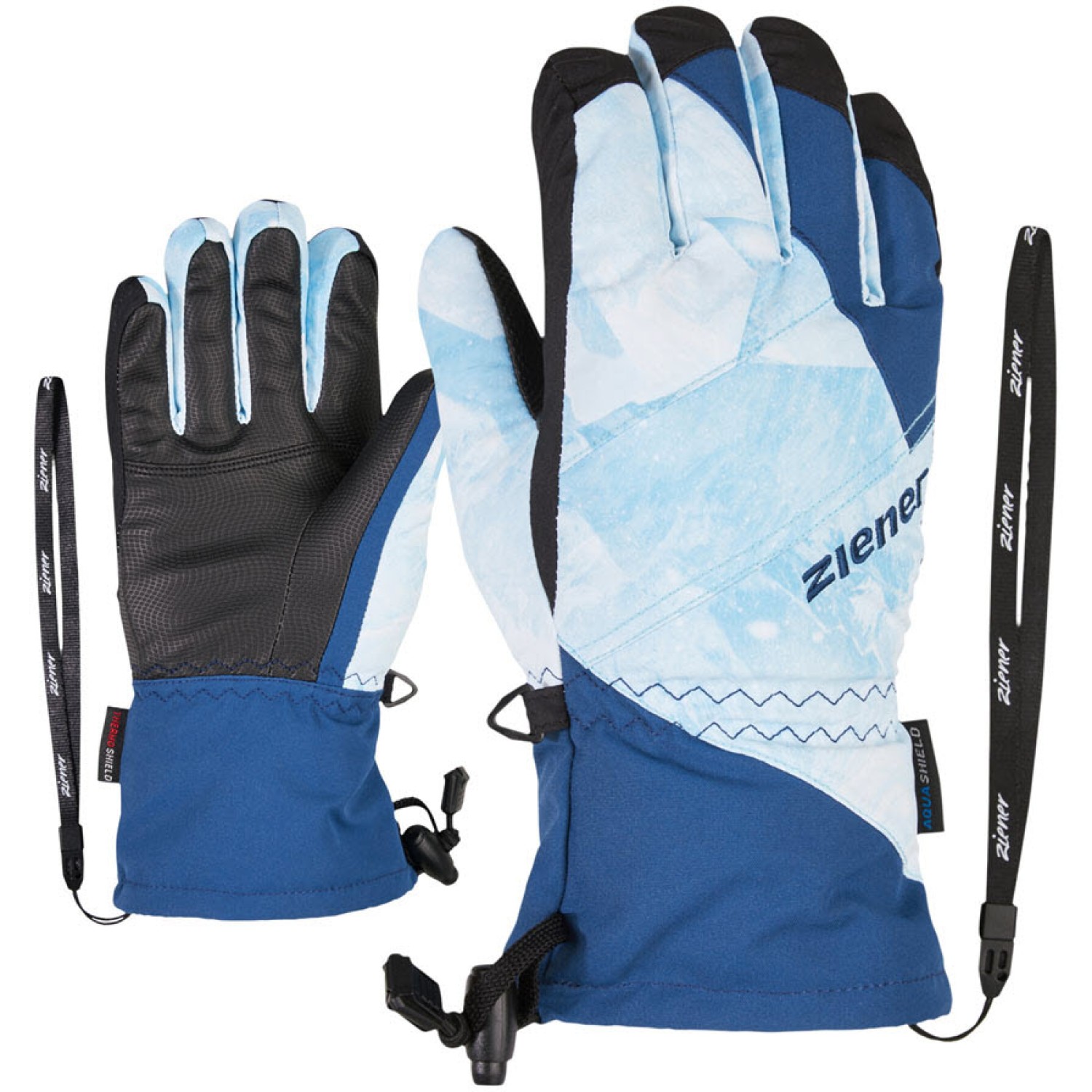 Μοντέρνο παιδικό γάντι για σκι με μακριά μανσέτα. AGIL AS® JUNIOR, κομψά παιδικά γάντια για σκι με ασύμμετρα σχεδιαστικά στοιχεία και print παλάμες. Άνετα γάντια σκι παιδικά τα ZIENER AGIL AS® με αδιάβροχη και διαπνέουσα μεμβράνη AQUASHIELD®. Η ειδική εσωτερική μεμβράνη εξασφαλίσει ένα πολύ θερμό και στεγνό κλίμα εσωτερικά, ενώ η compact παλάμη επιτρέπει τέλεια μεταβίβαση της ισχύoς στα μπατόν. Το χρησιμοποιούμενο Θέρμομονωτικό υλικό κάνει τα γάντια επιπλέον ζεστά. Τα μακριά μανίκια με ειδικά κορδόνια μπορούν εύκολα να σφίξουν και να ασφαλίσουν  στα μανίκια χρησιμοποιώντας μόνο το ένα χέρι. Εχει συνθετικό δέρμα στην παλάμη για να έιναι πολύ μαλακό και να αντέχει στα σκισίματα, .Τα ειδικά λουριά ασφαλίζουν τα γάντια στους καρπούς επίσης.