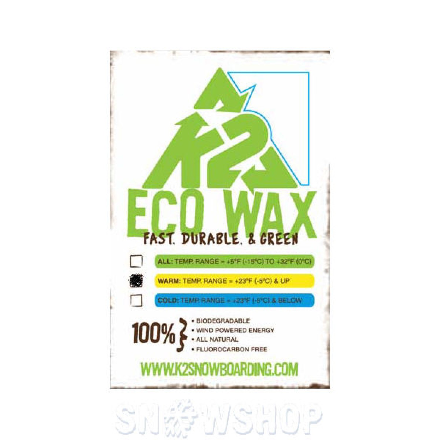 Νέο οικολογικό wax απο την Κ2 γενικής χρήσης για ski και snowboards και για όλους τους τύπους χιονιού. Είναι βιοδιασπώμενο οικολογικό ,χωρίς πρόσθετα απο fluorcarbon. Ενδείκνειτε για όλους τους τύπους των σκι καί τα snowboard, σε πρακτική συσκευασία τσέπης. Ειδικό για θερμοκρασίες από -5° 'εως πάνω.