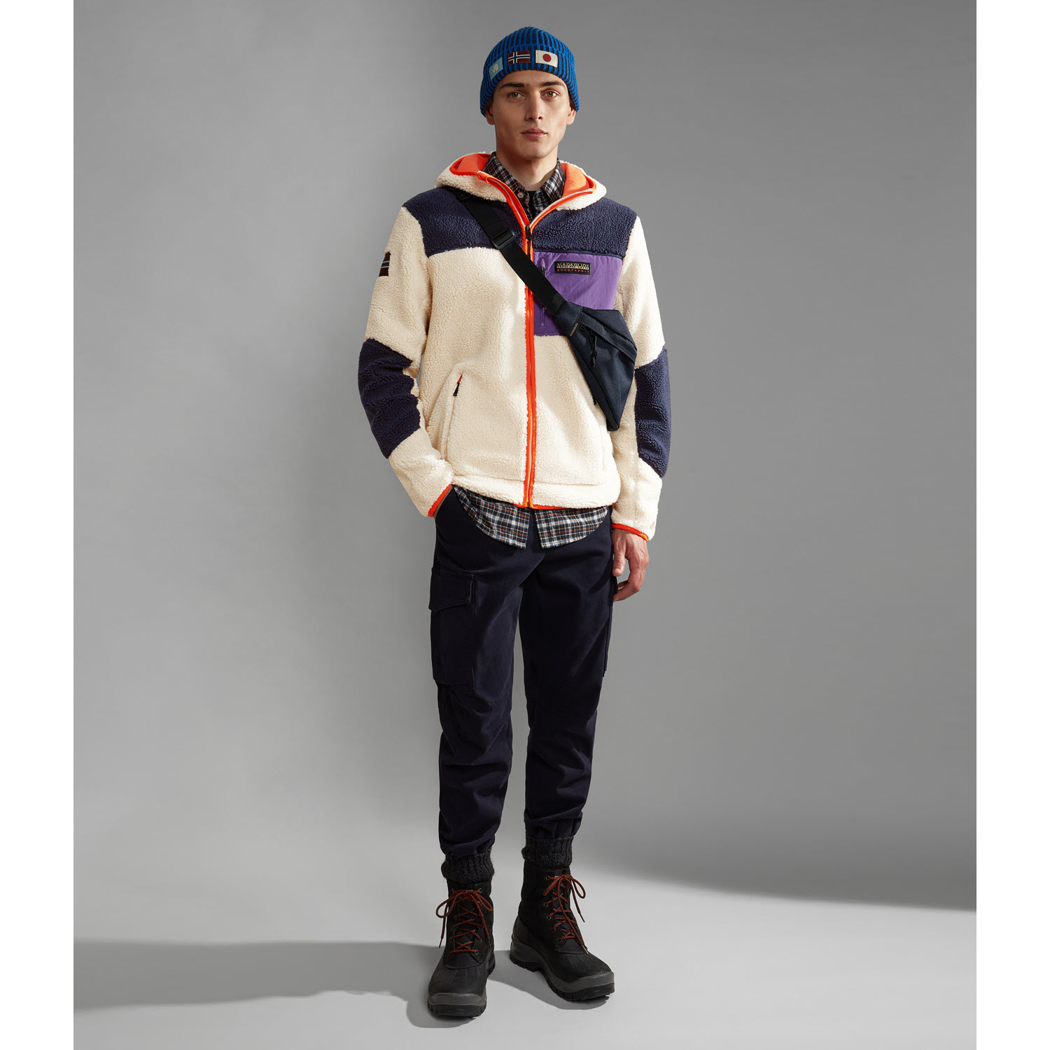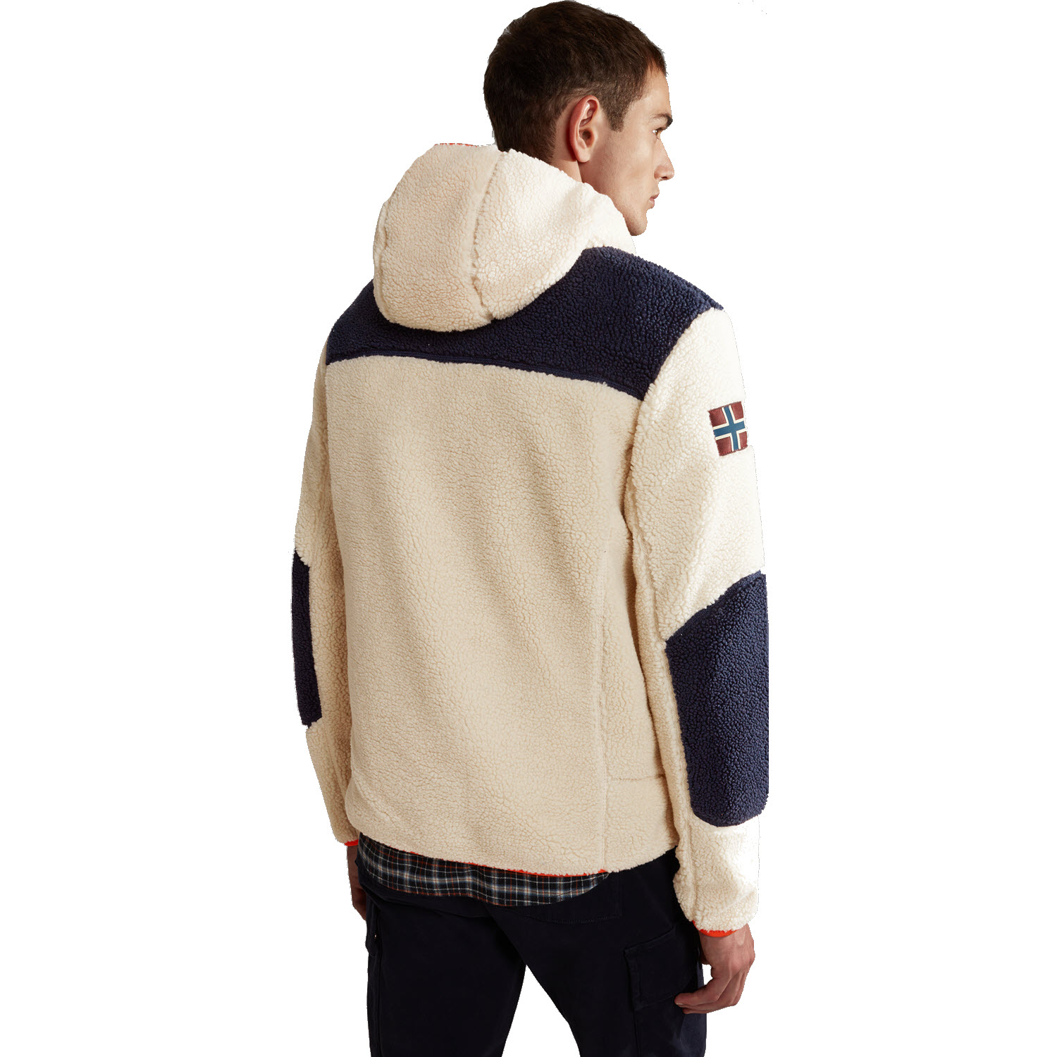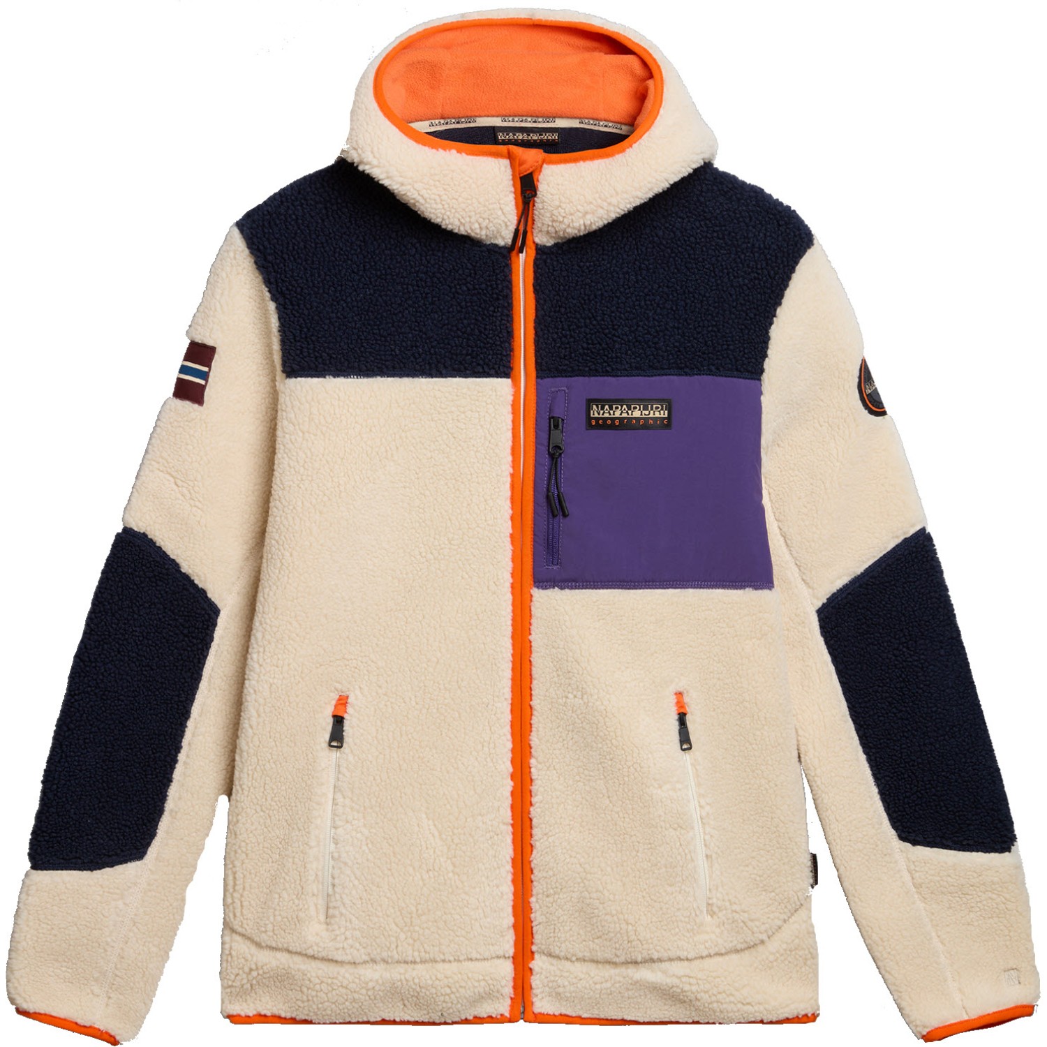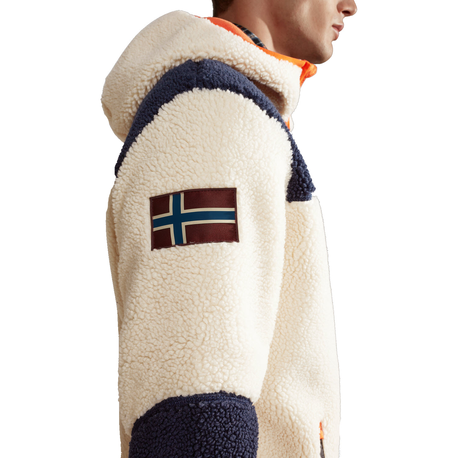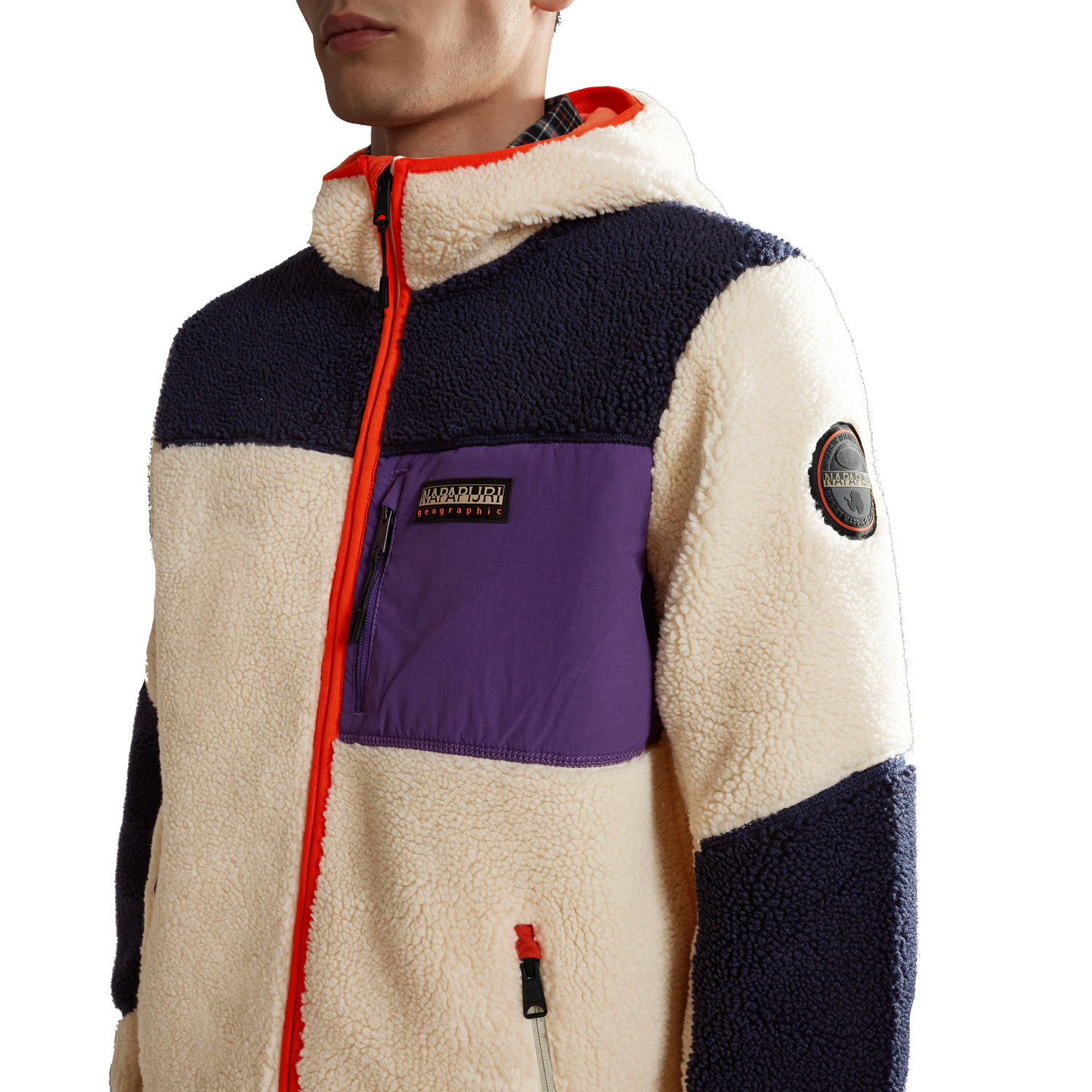 Οι Yupiks είναι αυτόχθονες που ζουν στην κεντρική Αλάσκα και τη Σιβηρία. Το όνομά τους προέρχεται από τις λέξεις Yup'ik 'yuk' (πρόσωπο) και '-pik' (πραγματικό). Είναι "πραγματικοί άνθρωποι" και ζουν ως τέτοιοι. Σε μια προσπάθεια να επισημάνουν το συναρπαστικό παρελθόν και το παρόν τους, η οικογένεια Yupik fleece επιστρέφει στην πραγματικότητα για να διακρίνει τα χαρακτηριστικά γνωρίσματα του DNA της Napapijri - το σγουρό μαλλί fleece - και τα ανακαλύπτει παίζοντας με χρώματα και εμβλήματα κληρονομιάς για να γιορτάσουν την προέλευσή του. Αυτή η έκδοση με φερμουάρ και κουκούλα διαθέτει πρακτικές τσέπες με φερμουάρ και κολάρο με προστατευτικό για το πηγούνι, για προστασία από τους χειμερινούς ανέμους.