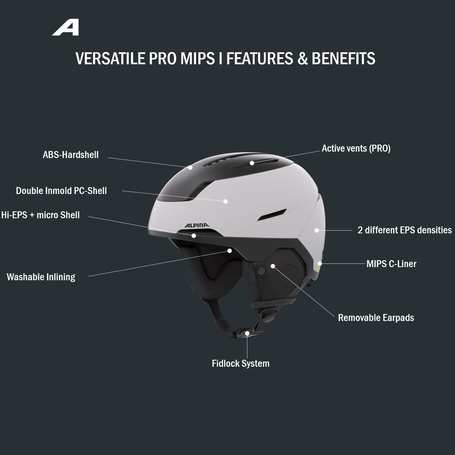 Versatile σημαίνει: προσαρμόσιμο, μετατρέψιμο. Και αυτό ακριβώς είναι αυτό το κράνος για σκι και snowboard. Με όλα τα χαρακτηριστικά του, μετατρέπει μια καλή μέρα στα βουνά σε μια πολύ καλή μέρα. Το Versatile Pro Mips είναι αισθητά ελαφρύ. Και αυτό γίνεται σκόπιμα, φυσικά, επειδή δεν εμποδίζει την ανάβαση στην κορυφή ή στις καταβάσεις μέσα σε βαθύ χιόνι. Το δεύτερο αξέχαστο χαρακτηριστικό του κράνους freeride είναι ο μοναδικός αερισμός. Εάν επιθυμείτε, παρέχει αρκετό φρέσκο αέρα για να δροσίζει το κεφάλι ακόμα και τις ζεστές μέρες και υπό μέγιστο φορτίο. Επιπλέον, τα μαξιλαράκια αυτιών μπορούν να αφαιρεθούν για ακόμα μεγαλύτερη ευελιξία στην ανάβαση ή την άνοιξη. Το τρίτο χαρακτηριστικό είναι ο εκλεπτυσμένος συνδυασμός διαφορετικών πυκνοτήτων και υλικών EPS, που εξασφαλίζει μέγιστη ασφάλεια και δίνει επίσης στο Versatile Pro Mips μια μοναδική εμφάνιση. Το Mips είναι επίσης ενσωματωμένο στο κράνος και έχει σχεδιαστεί για να απορροφά τις περιστροφικές δυνάμεις που μπορεί να προκύψουν σε περίπτωση κρούσης υπό γωνία. Ένα μαγνητικό κούμπωμα Fidlock στο πηγούνι είναι τοποθετημένο για να διασφαλίζει ότι το Versatile Pro Mips δεν θα βγει από το κεφάλι ακόμα και σε περίπτωση tomahawk, αλλά μπορεί να ανοίξει ή να κλείσει με το ένα χέρι. .Ολα τα κράνη ALPINA διαθέτουν τις τελευταίες Ευρωπαικές προδιαγραφές ασφαλείας CE EN 1077 standard. Σας ευχόμαστε να απολαμβάνετε πάντα ευχάριστες και ασφαλείς διαδρομές με το καινούριο σας κράνος!