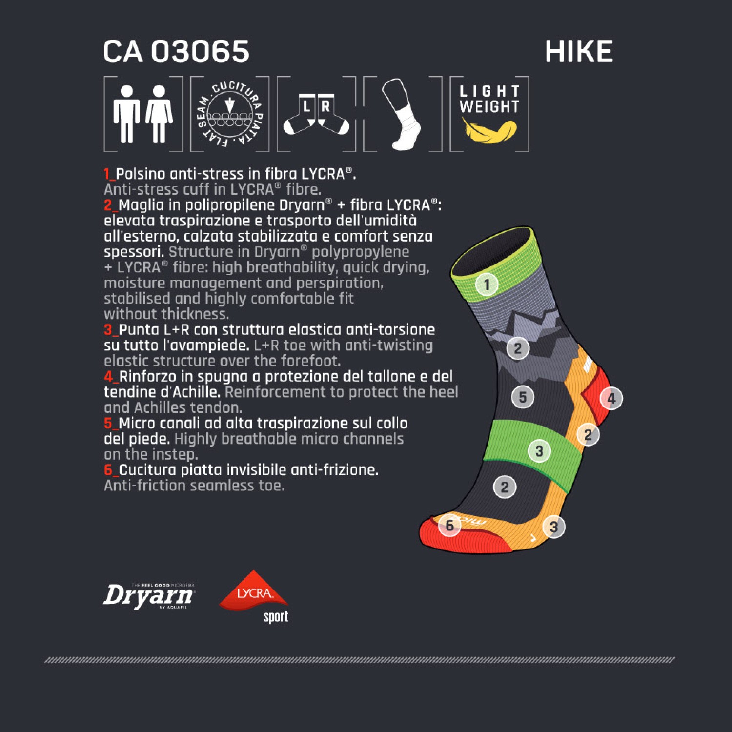 Οι κάλτσες outdoor Mico Extra DryLight Weight είναι κατασκευασμένες από πολυπροπυλένιο Dryarn® + ίνα LYCRA®: υψηλή αναπνοής, για γρήγορο στέγνωμα, διαχείριση της υγρασίας και αποβολής του ιδρώτα , εξαιρετική πρόσφυση, ελαστικότητα και άνεση χωρίς ιδιαίτερο πάχος. Εργονομική κατασκευή δακτύλων σε ελαφρύ σφουγγάρι με πρότυπο την ανατομία των πέντε δακτύλων. To υλικό εσωτερικά , σε συνδυασμό με το PA πού επίσης υπάρχει σαν υλικό είναι πάρα πολύ ανθεκτικό και μεταφέρει την υγρασία από το εσωτερικό πρός τα έξω κρατώντας το πόδι σας στεγνό και ζεστό. Ειδικές ενισχύσεις στα σημεία πού καταπονούνται περισσότερο με τα μποτάκια σας καθώς και στον αστράγαλο και στον αχίλλειο τένοντα .Δεξιά και Αριστερή κάλτσα για  ανατομικό σχεδιασμό με επίπεδη ραφή στα δάκτυλα για μεγαλύτερη άνεση , καθώς δεν προκαλεί φαγούρα και κνησμό. Ειδική κατασκευή κρατάει την κάλτσα πάντα σταθερή στο πόδι.