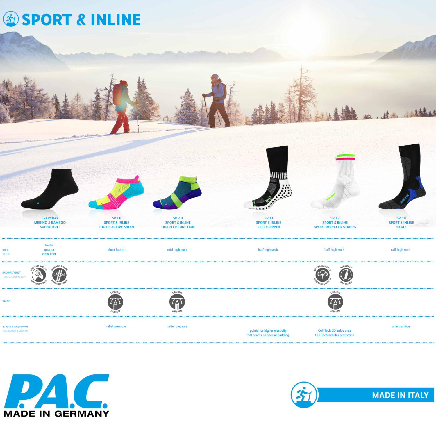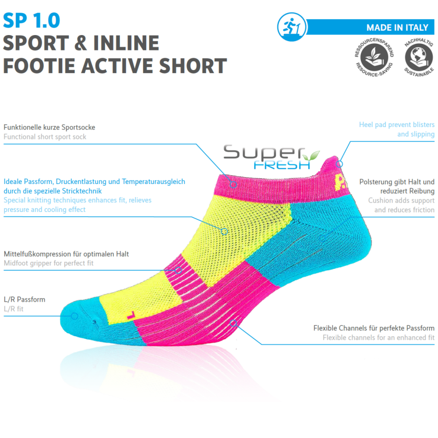 Το μοντέλο SP 1.0 Sport Footie Active Short από την P.A.C. είναι η σωστή επιλογή για πολλά αθλήματα. Οι κάλτσες εντυπωσιάζουν με την ιδανική εφαρμογή, την ανακούφιση από την πίεση και την ειδική τεχνολογία πλεξίματος που εξασφαλίζει εξισορρόπηση θερμοκρασίας, ώστε να μην ιδρώνεις ποτέ. Προσφέρουν τέλεια εφαρμογή, διατήρηση του σχήματος (φόρμας) και ανθεκτικότητα. Διαθέτουν ενισχύσεις σε προβληματικές περιοχές για την ανακούφιση της πίεσης, άνετες μανσέτες και ελαστικά κανάλια για τέλεια εφαρμογή. Η συμπίεση στο μέσο του ποδιού εξυπηρετεί την στήριξη καθώς και την μακροζωία της κάλτσας. Είναι επίσης L/R ανατομικά σχεδιασμένες για ανδρικά και γυναικεία πόδια. Θα τις βρείτε σε πολλά χρώματα και μεγέθη!