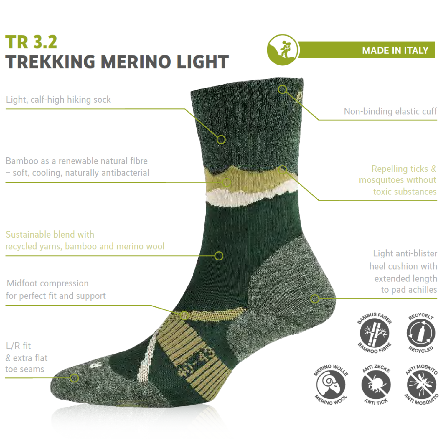 Βιώσιμες, λειτουργικές και άνετες, οι κάλτσες TR 3.2 Trekking Merino Light Kids της P.A.C. είναι εξαιρετικές από κάθε άποψη! Το προϊόν αυτό αποτελείται από ένα συνδυασμό υλικών, με βιώσιμο και φιλικό προς το περιβάλλον υπόβαθρο. Ο συνδυασμός του μπαμπού ως ανανεώσιμη φυσική ίνα, mulesing-free μαλλί merino και θαλάσσια απόβλητα, που αλιεύονται από τους ωκεανούς, ανακυκλώνονται και μεταποιούνται σε ίνες υψηλής ποιότητας, δημιουργεί ένα υψηλών προδιαγραφών προϊόν, εξαιρετικά φιλικό προς το περιβάλλον. Επιπλέον, σας προστατεύουν από τα τσιμπούρια και τα κουνούπια χωρίς τη χρήση Deet ή Permethrin, έχοντας έτσι σημανθεί ως ασφαλή για την υγεία παιδιών και εγκύων από τον Παγκόσμιο Οργανισμό Υγείας (World Health Organization). Χάρη στην εργονομική εφαρμογή αριστερά/δεξιά και επιπλέον επίπεδες ραφές στα δάχτυλα, οι κάλτσες αυτλες είναι πολύ άνετες στη χρήση. Η ελαστική μανσέτα στο επάνω μέρος της κάλτσας και η συμπίεση στο μέσο του πέλματος εξασφαλίζουν άριστη στήριξη χωρίς πίεση. Οι ζώνες πίεσης στο πόδι είναι ελαφρώς επενδυμένες, όπως και ο αχίλλειος τένοντας, για να αποφευχθούν φουσκάλες και ερεθισμοί. Διατίθεται και σε άλλα χρώματα!