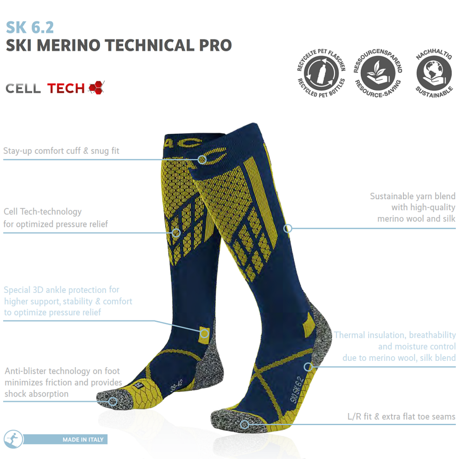 σταθερότητας και εξασφαλίζει καλύτερη κυκλοφορία του αίματος, Βιώσιμο μείγμα νημάτων με άλλα νήματα υψηλής ποιότητας, θερμορύθμιση, διαπνοή και έλεγχος υγρασίας χάρη στο συνδυασμό μεταξιού και μαλλιού Merino, Cell Tech-Τεχνολογία για βελτιστοποιημένη ανακούφιση πίεσης.