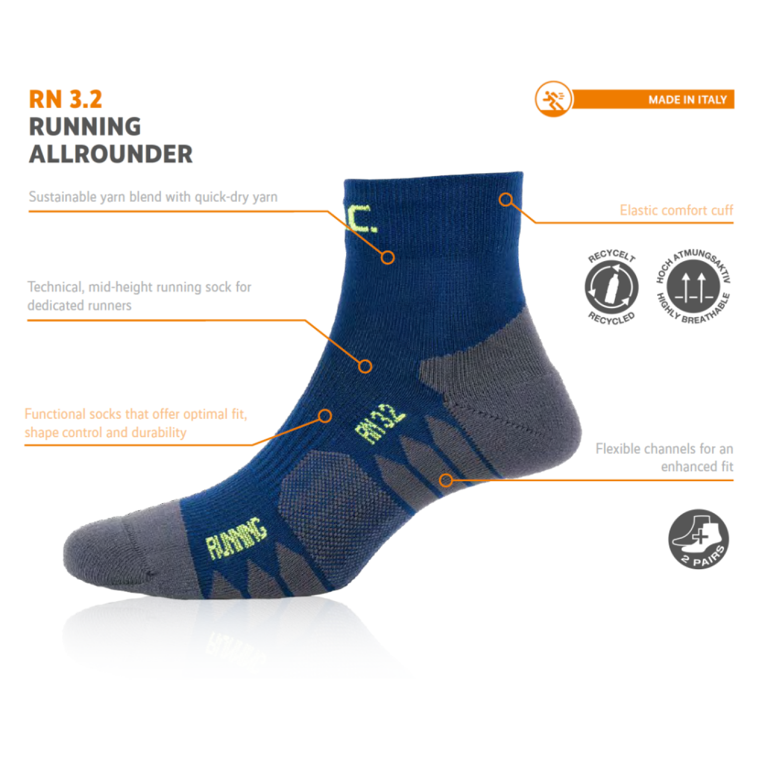 Η PAC RN 3.2 Allrounder είναι μια τεχνική, Mid-Weight κάλτσα τρεξίματος για αφοσιωμένους δρομείς. Αυτή η λειτουργική κάλτσα προσφέρει άριστη εφαρμογή, διατήρηση της φόρμας/σχήματος και ανθεκτικότητα. Χαρακτηριστικά όπως η ελαστική μανσέτα και τα ελαστικά κανάλια συμβάλλουν στη άψογη εφαρμογή δίνοντάς μας μια κάλτσα που μπορείτε να φοράτε άνετα όλη την ημέρα. Αυτό το προϊόν χρησιμοποιεί ένα βιώσιμο μείγμα νημάτων αποτελούμενο από ανακυκλωμένα υλικά, που κάνει το ύφασμα να στεγνώνει γρήγορα, διασφαλίζοντας ότι τα πόδια σας παραμένουν στεγνά κατά τη διάρκεια κάθε αθλητικής δραστηριότητας. Θα το βρείτε σε συσκευασία 2 ζευγαριών και σε διάφορα χρώματα!