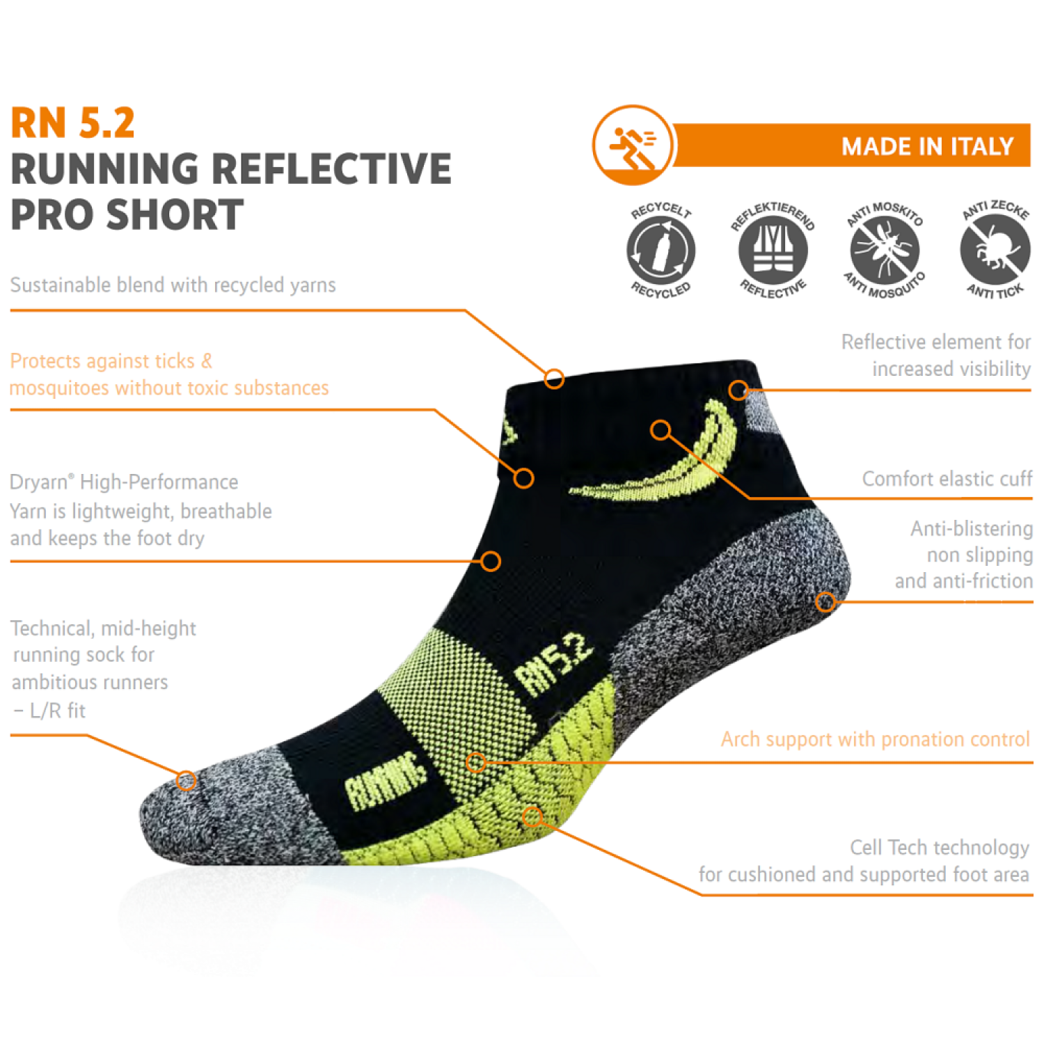 Το μοντέλο RN 5.2 Running Reflective Pro Short της P.A.C. είναι η τέλεια επιλογή για απαιτητικούς δρομείς. Αυτή η αθλητική κάλτσα τα έχει όλα και είναι έτοιμη να βοηθήσει κάθε αθλητή να πετύχει τους στόχους του. Το βιώσιμο μείγμα υφασμάτων με ανακυκλωμένα νήματα δείχνει την περιβαλλοντική ευαισθητοποίηση της γερμανικής εταιρείας, ενώ το απαλλαγμένο από τοξίνες απωθητικό κατά των εντόμων και των κουνουπιών παρέχει φυσική προστασία. Το ελαφρύ νήμα υψηλής απόδοσης Dryarn® διατηρεί το πόδι στεγνό, ενώ η τεχνολογία CellTech παρέχει βελτιωμένη αντικραδασμική προστασία κάτω από το πέλμα του ποδιού. Με τεχνική εφαρμογή R/L, τεχνολογία ενάντια στις φουσκάλες, ελαστικές μανσέτες, υποστήριξη της καμάρας και ενσωματωμένα ανακλαστικά στοιχεία για μέγιστη άνεση και ορατότητα όταν τρέχετε στο σκοτάδι ή σε συνθήκες χαμηλού φωτισμου, αυτή η κάλτσα τα έχει όλα! Διατίθεται και σε άλλα χρώματα!