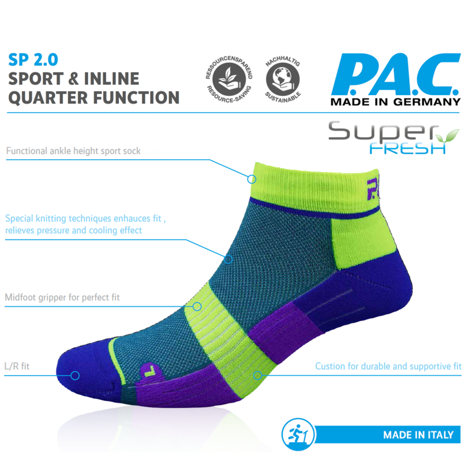 Το μοντέλο SP 2.0 Sport Quarter Function από την P.A.C. είναι η σωστή επιλογή για πολλά αθλήματα. Οι κάλτσες εντυπωσιάζουν με την ιδανική εφαρμογή, την ανακούφιση από την πίεση και την ειδική τεχνολογία πλεξίματος που εξασφαλίζει εξισορρόπηση θερμοκρασίας, ώστε να μην ιδρώνεις ποτέ. Προσφέρουν τέλεια εφαρμογή, διατήρηση του σχήματος (φόρμας) και ανθεκτικότητα. Διαθέτουν ενισχύσεις σε προβληματικές περιοχές για την ανακούφιση της πίεσης, άνετες μανσέτες και ελαστικά κανάλια για τέλεια εφαρμογή. Η συμπίεση στο μέσο του ποδιού εξυπηρετεί την στήριξη καθώς και την μακροζωία της κάλτσας. Είναι επίσης L/R ανατομικά σχεδιασμένες για ανδρικά και γυναικεία πόδια. Θα τις βρείτε σε συσκευασία 2 τεμαχίων, σε πολλά χρώματα και μεγέθη!