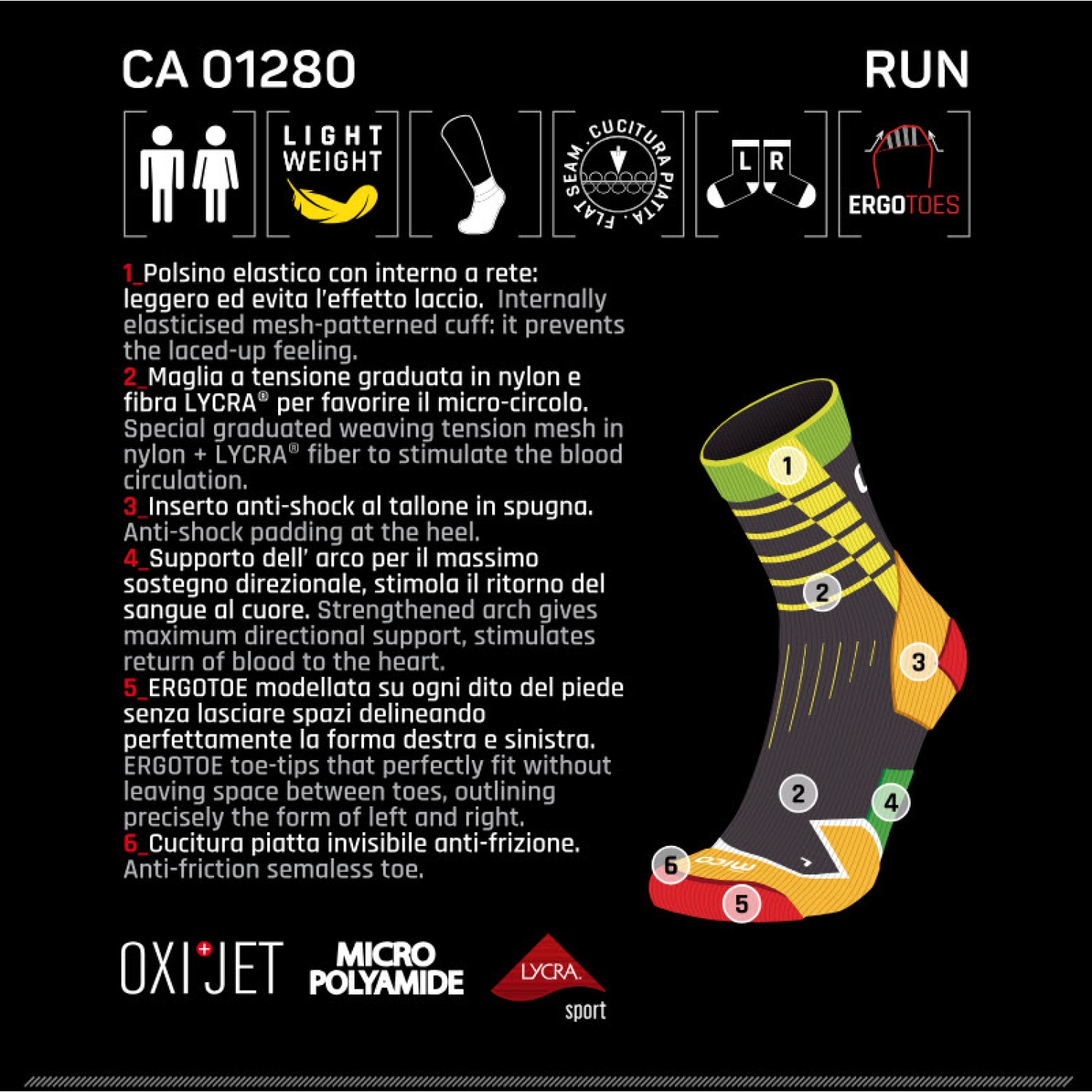 φλεβικής και λεμφικής κυκλοφορίας του αίματος κατά τη διάρκεια της άθλησης . Το Ιταλικό Κολλέγιο Φλεβολογίας (CIF) έχει πιστοποιήσει ότι αυτές οι κάλτσες πληρούν τις προϋποθέσεις για τη σωστή συμπίεση. Ειδικός σχεδιασμός σχεδιασμένος για το αριστερό πόδι και το δεξί πόδι ,με αόρατες επίπεδες ραφές αντι-τριβής. Τα δάχτυλα παραμένουν ελεύθερα για κίνηση, λόγω της απουσίας συμπίεσης, επιτρέπουν τη μέγιστη πρόωση κατά το τρέξιμο. Ειδικό μαξιλαράκι για την προστασία του Αχίλλειου τένοντα μορφοποιημένο στο σχήμα του. Πλανητική στήριξη τόξου παρέχει μέγιστη κατευθυντική υποστήριξη, διεγείρει την κυκλοφορία του αίματος που επιστρέφει στην καρδιά. Υφάσματα μεταβλητά για εύκολη διαπνοή και υλικό μεσαίας συμπίεσης