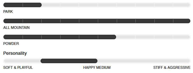 Σκληρότητα : 2 Μαλακή/Μεσαία σκληρότητα (1 μαλακή - 5 σκληρή) - Ένα μέσο flex εξασφαλίζει έλεγχο και απόκριση, αλλά και αρκετά εύκαμπτο για την πούδρα και τα μαλακά χιόνια και τα jib..